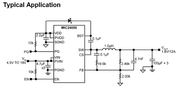 MIC24055는 4.5V ~ 19V의 입력 전원 범위에서 작동하며 최대 12A의 출력 전류를 조절 출력합니다. 출력 전압은 ±1%의 정확도를 보장하면서 최저 0.8V까지 조정 가능하며, 이 소자는 600kHz의 스위칭 주파수에서 동작합니다.