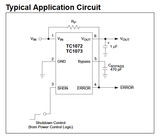 TC1072 및 TC1073은 1μF의 출력 커패시터로 안정적이며 50mA의 최대 출력 전류를 갖습니다. 보다 높은 출력 전류 버전의 경우 TC1185, TC1186, TC1187 (IOUT=150mA) 및 TC1107, TC1108 및 TC1173 (IOUT=300mA) 데이터 시트를 참조하십시오.