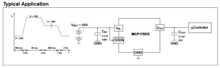 2.4V의 셧다운 시 낮은 UVLO는 자동차 애플리케이션의 콜드 크랭킹 조건에 적합합니다. MCP1792/3은 3.3V 및 5.0V의 2 가지 고정 출력 전압 버전으로 제공됩니다. 레귤레이터 출력은 2.2μF 세라믹 커패시터로 안정적입니다. 이 디바이스는 전류 폴드 백 기능과 열 셧다운 보호 기능으로 과열과 단락 상황으로부터 보호됩니다.