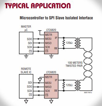 LTC6820은 단일 트위스트 페어 연결을 통해 두 개의 절연된 디바이스 간에 양방향 SPI 통신을 제공합니다. 각 LTC6820은 논리 상태를 신호로 인코딩하여 절연 장벽을 통해 다른 LTC6820으로 전송됩니다. 수신 LTC6820은 전송을 디코딩하고 슬레이브 버스를 적절한 논리 상태로 구동합니다. 절연 장벽은 수백 볼트의 절연을 달성하기 위해 간단한 펄스 변압기로 연결될 수 있습니다.