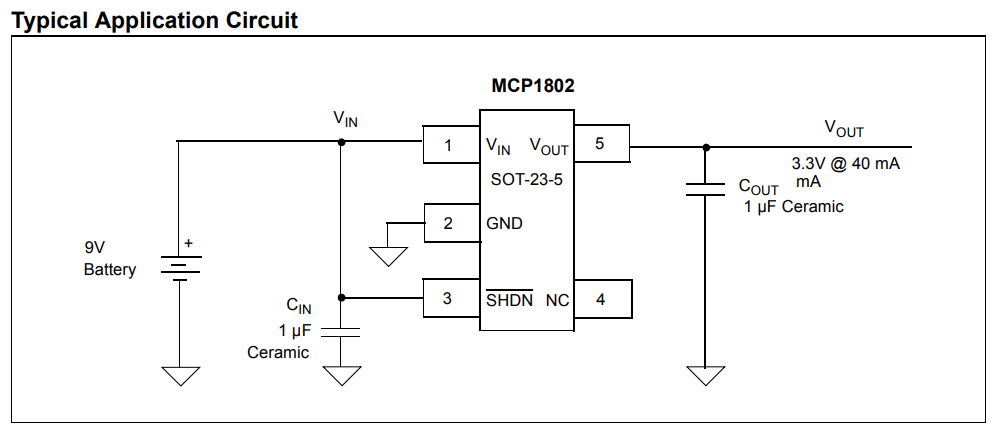 LDO 출력은 최소 1µF의 출력 커패시턴스로 안정적입니다. 세라믹, 탄탈륨 또는 알루미늄 전해 커패시터는 모두 입력 및 출력에 사용할 수 있습니다. 전류 폴드백이 있는 과전류 제한은 단락 보호 기능을 제공합니다. 종료(SHDN) 기능을 사용하면 출력을 활성화하거나 비활성화할 수 있습니다. 비활성화된 경우 MCP1802는 0.01µA의 전류만 소비합니다(일반).