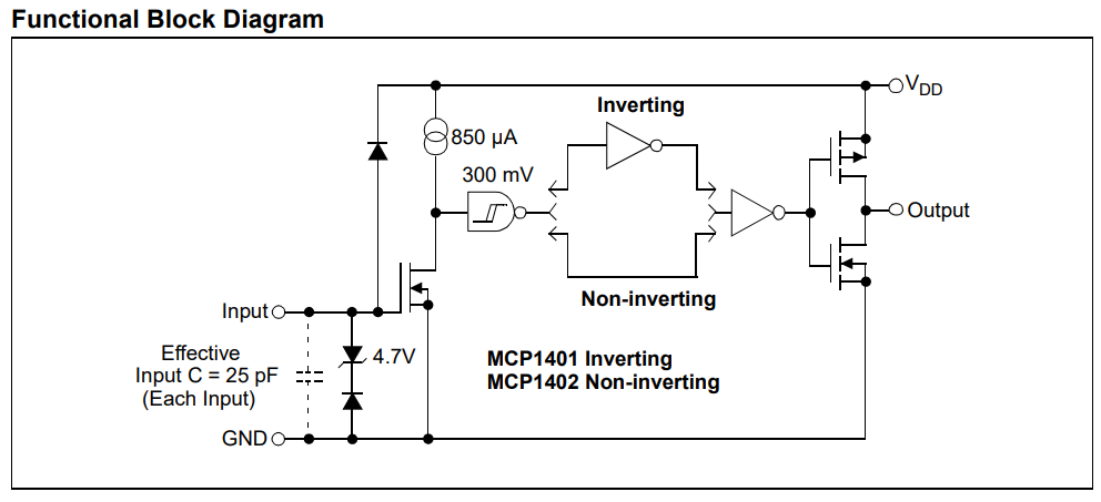 MCP1401/02 장치는 단일 4.5V ~ 18V 전원 공급 장치에서 작동하며 19ns(일반) 미만에서 470pF 게이트 커패시턴스를 쉽게 충전 및 방전할 수 있습니다. MOSFET의 의도된 상태가 큰 과도 상태에 의해 영향을 받지 않도록 하기 위해 On 및 Off 상태 모두에서 충분히 낮은 임피던스를 제공합니다.