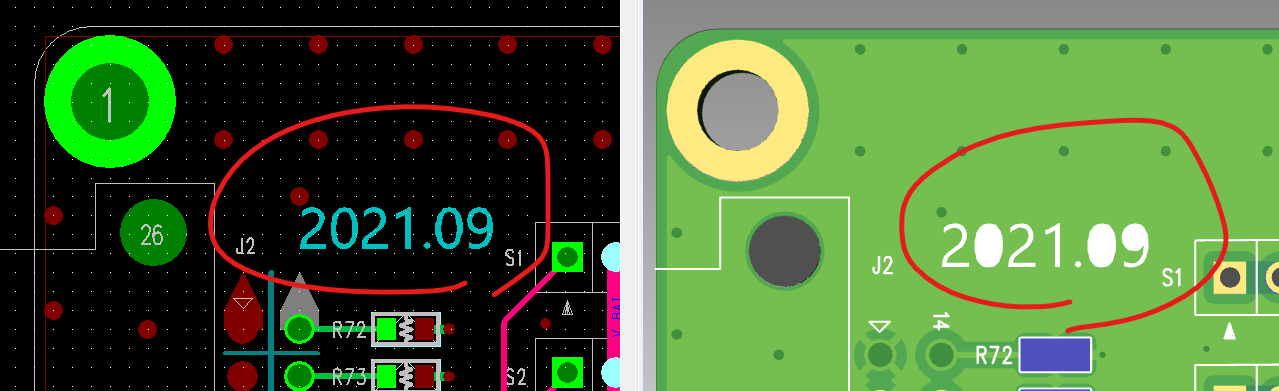 3D 화면에서는 특정폰트의 원형부분이 메꿔져서 보인다. 큰 상관은 없으나 실물PCB와 똑같이 보이지 않을 테니 폰트 설정을 잘해야 한다.