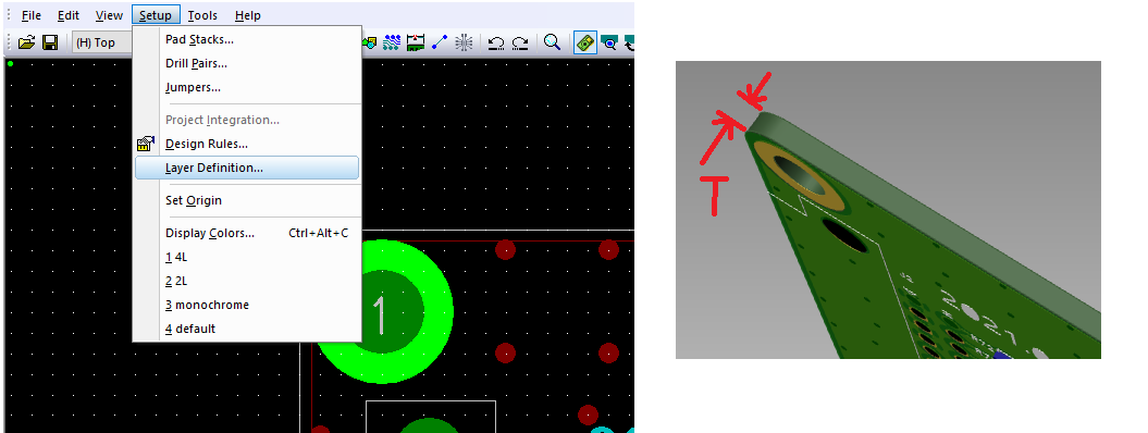 PCB 두께 설정은 Setup - Layer Definition 의 Thickness 에서 설정해 줘야 3D에 반영된다.
