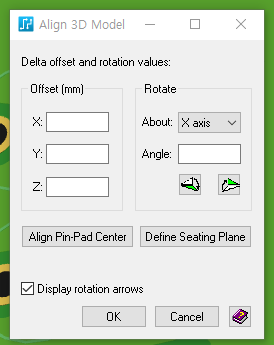 3D 부품을 풋프린트에 등록하는 절차는 복잡하지 않다. 다만 위치를 잡는데 숫자를 넣어야 해서 좀 까다롭다. 버튼으로 클릭클릭하여 위치를 잡아주게 해주면 직관적이고 좋을 듯 하다.