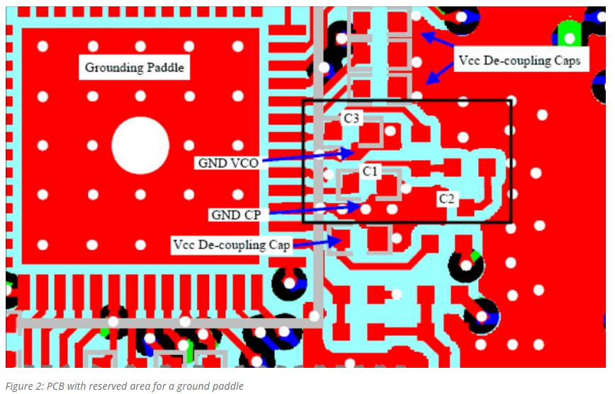 대부분의 집적 회로는 구성 요소 바로 아래에 위치한 구성 요소 레이어(PCB의 상단 또는 하단 레이어)에 연속 접지면이 필요합니다. 이 평면은 CC 및 RF 신호의 반환 전류를 할당된 접지 평면으로 가져오는 목적이 있습니다. 또한, 소위 "접지 패들"(그림 2)은 과도한 열을 발산하는 2차 기능을 수행하므로 적절한 비아 홀이 제공되어야 합니다. 이러한 비아는 PCB의 여러 레이어를 가로지르는 스루 홀이어야 하며 내부적으로 도금되고 소산 효과를 증폭하기 위해 열 전도성 페이스트로 채워져야 합니다.