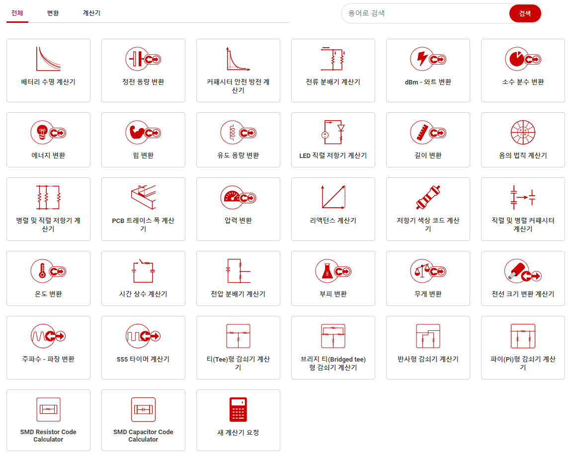 배터리 수명 계산기, 정전 용량 변환, 커패시터 안전 방전 계산기, 전류 분배 계산기, dBm-와트 변환, 소수 분수 변환, 에너지 변환, 힘 변환, 유도 요량 변환, LED 직렬 저항기 계산기, 길이 변환, 옴의 법치 계산기, 병렬 및 직렬 저항기 계산기, PCB 트레이스 폭 계산기, 압력 변환, 리액턴스 계산기, 저항기 색상 코드 계산기, 직렬 및 병렬 커패시터 계산기, 온도 변환, 시간 상수 계산기, 전압 분배 계산기, 부피 변환, 무게 변환, 전선 크기 변환 계산기, 주파수 - 파장 변환, 555 타이머 계산기, 티(Tee)형 감쇠기 계산기, 브리지 티(Bridged Tee)형 감쇠기 계산기, 반사형 감쇠기 계산기, 파이(Pi)형 감쇠기 계산기, SMD Resistor Code Calculator, SMD Capacitor Code Calculator, 새 계산기 요청