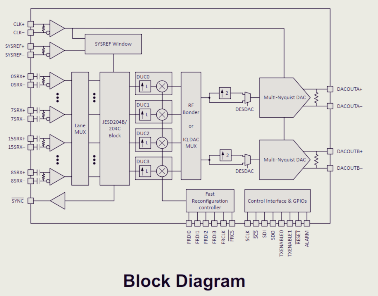 JESD204B 및 JESD204C 호환 직렬 인터페이스에는 최대 12.8Gbps까지 가능한 16개의 수신기 쌍이 있습니다. 인터페이스는 SYSREF를 사용하여 결정적 대기 시간 및 다중 장치 동기화를 위해 JESD204B 및 JESD204C 하위 클래스 1을 준수합니다.