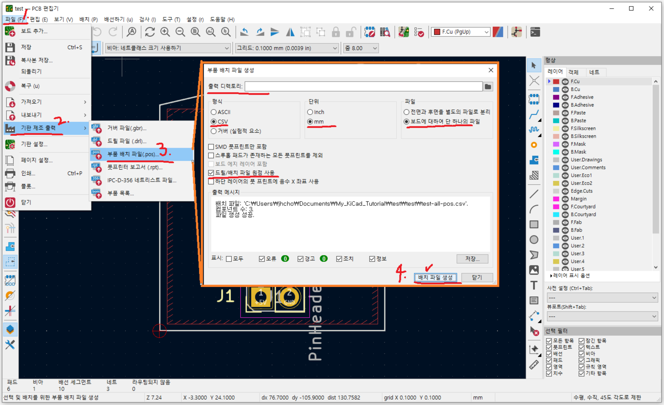 kicad에서 좌표데이터를 추출하는 방법을 알아보자. 간단하다.