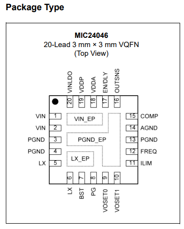 MIC24046은 작동 접합 온도 범위가 –40°C ~ +125°C인 열 효율적이고 공간 절약형 20리드 3mm × 3mm VQFN 패키지로 제공됩니다.