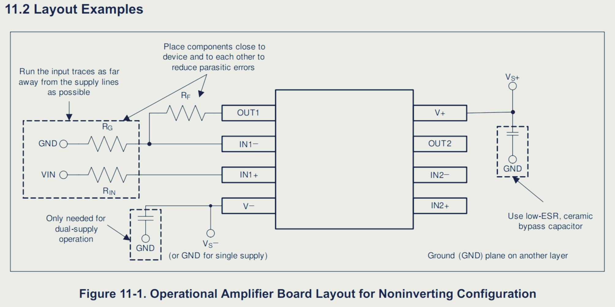 • 외부 구성요소를 장치에 최대한 가깝게 배치하십시오. 섹션 11.2에 표시된 것처럼 RF와 RG를 반전 입력에 가깝게 유지하면 기생 커패시턴스가 최소화됩니다.