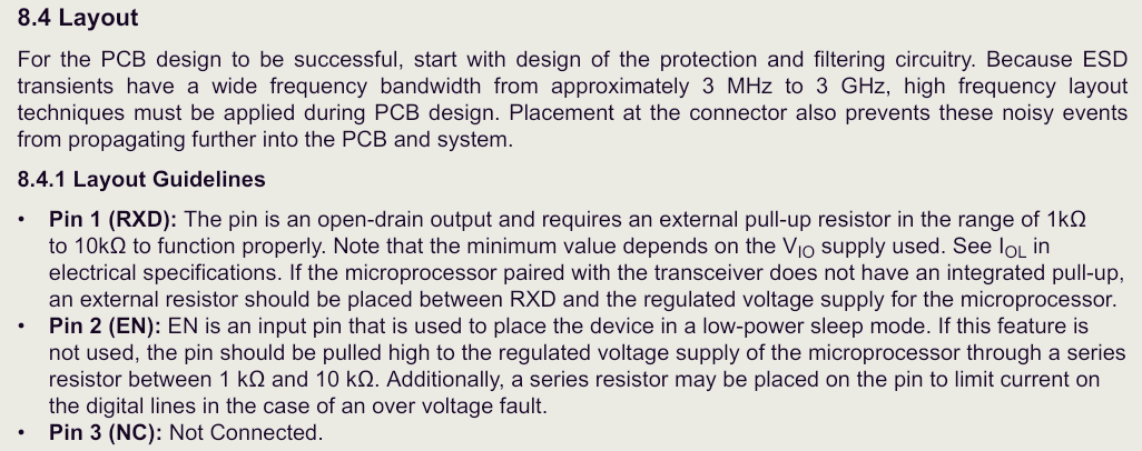LIN 수신기는 더 빠른 인라인 프로그래밍을 위해 최대 100kbps의 데이터 속도를 지원합니다. TLIN2029A-Q1은 EME(전자기 방출)를 줄이는 전류 제한 파형 형성 드라이버를 사용하여 TXD 입력의 데이터 스트림을 LIN 버스 신호로 변환합니다. 수신기는 데이터 스트림을 오픈 드레인 RXD 핀을 통해 마이크로프로세서로 전송되는 논리 레벨 신호로 변환합니다. LIN 버스 또는 EN 핀을 통해 절전 모드를 해제할 수 있는 절전 모드를 사용하면 초저전류 소비가 가능합니다.