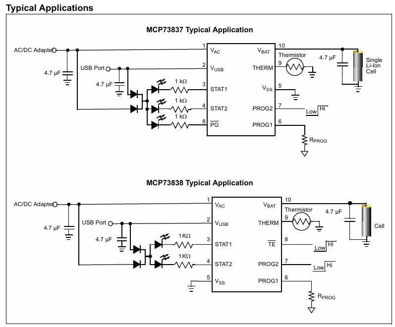 MCP73837/8은 시스템의 전원 소스로 USB 포트 또는 AC 어댑터를 자동으로 선택합니다. USB 포트로 구동되는 시스템의 경우, MCP73837/8은 USB 사양에 따라 전류 한도를 준수합니다. 호스트 마이크로컨트롤러는 저전력 USB 포트용 100mA 또는 고전력 USB 포트용 500mA의 두 가지 최대 충전 전류를 선택할 수 있습니다. AC 어댑터가 시스템에 전원을 공급하는 경우, 외부 저항기를 통해 시스템 또는 충전 전류의 크기를 최대 1A까지 설정할 수 있습니다.