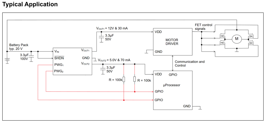 MCP1722는 3.3V 또는 5.0V를 μProcessor에 공급하도록 설계된 듀얼 출력, 고전압, 저드롭아웃(LDO) 레귤레이터입니다. 전류 용량은 100mA이며, 전류 용량이 50mA인 모터 드라이버에 10V 또는 12V를 제공합니다. 이러한 사양은 20V 배터리 팩이 있는 핸드헬드 전동 공구에 이상적입니다.